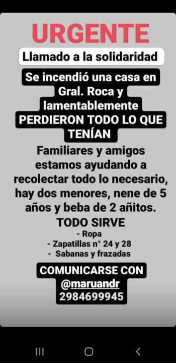 Ayer, vecinos y amigos iniciaron una campaña solidaria para ayudar a la familia, que quedó con lo puesto. Necesitan ropa, zapatillas N° 24 y 28 para sus hijos pequeños, sábanas y frazadas. La campaña en Instargram pide comunicarse con @maruandr y si no al celular 2984-699945.