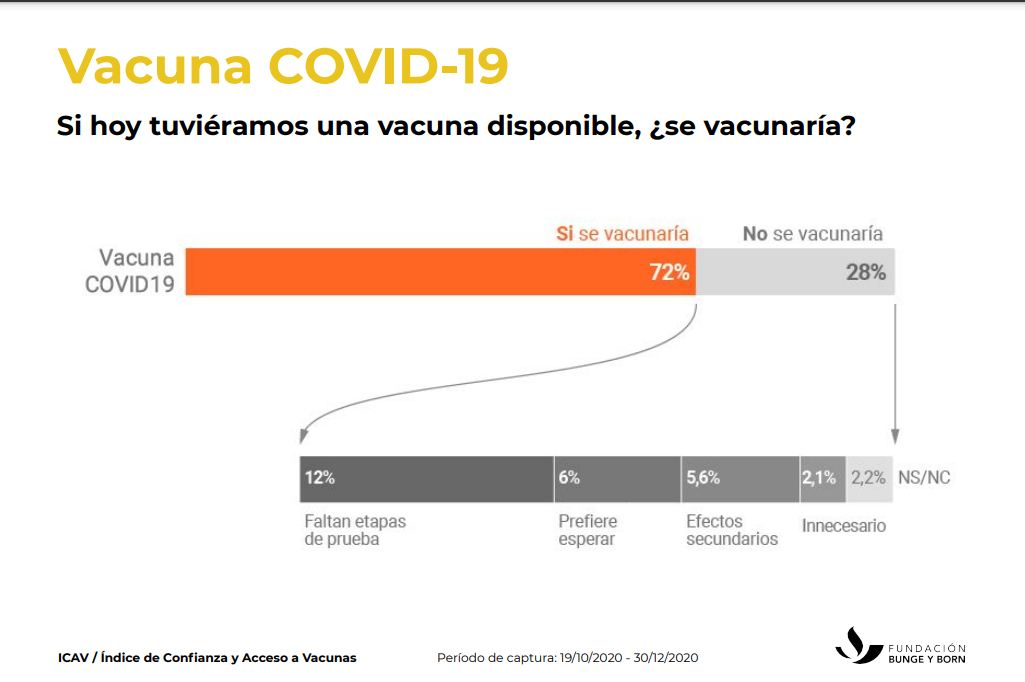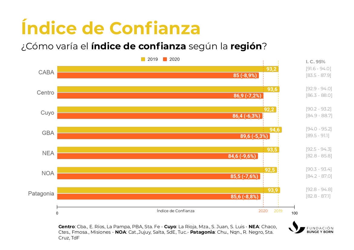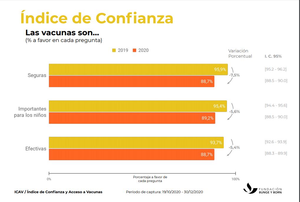 La Fundación Bunge y Born presentó los resultados del Índice de Confianza y Acceso a Vacunas 2020 (ICAV) en la Argentina, que permite analizar las variaciones en el nivel de confianza de la población sobre las vacunas y determinar la presencia de barreras en el acceso a las mismas. Es el segundo que se realiza y permite por eso hacer comparaciones. El índice de confianza 2020 resultó del 86,9 a nivel país, que si bien se mantuvo dentro de parámetros altos, disminuyó 7,2% respecto de 2019. Ese año, los encuestados tenían una confianza del 93.7%, según el primer estudio de la Fundación.