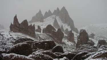 La nevada que cayó en las últimas horas dejó hermosas postales en la región. Aquí, Los Bolillos y sus tótems naturales cubiertos de blanco.