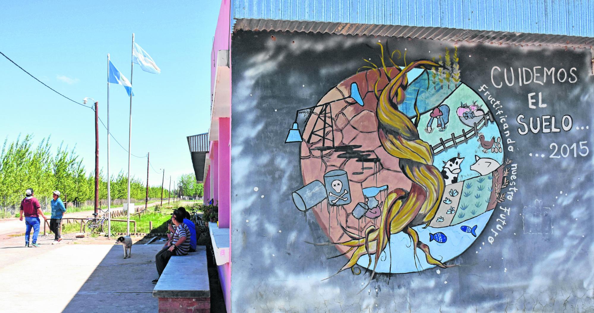 El mural de ingreso a la escuela marca un claro contraste entre las actividades, donde el costado hidrocarburífero es de desierto y muerte. “La escuela se inició junto con la explotación del fracking. Vinieron empresas a las escuelas a tratar de subsidiar a la escuela y el equipo directivo estaba en oposición, por lo que no se desarrolló una relación con las petroleras. Desde una mirada personal, hoy están fracturando y creo que debemos generar alguna convivencia en esto”, analizó Sosa.