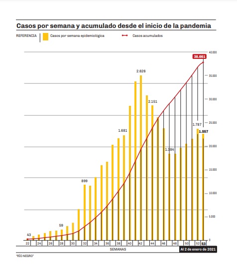 En El Bolsón esa misma comparación arroja un salto de 12 nuevos casos registrados del 1 al 4 de diciembre, a 50 casos acumulados del 1 al 4 de enero.