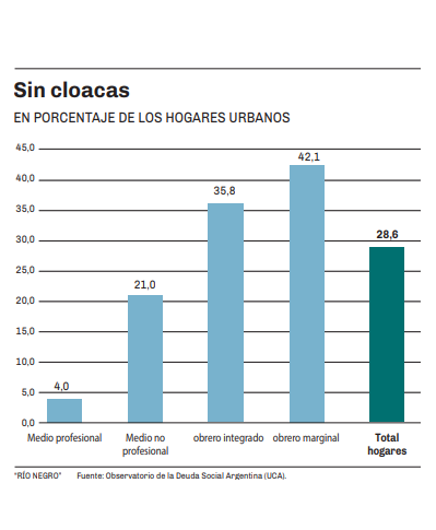 En cuanto a la ausencia de cloacas, alcanza a solo el 4,4% de las casas de los profesionales medios, pero afecta al 35,8% de los obreros integrados y al 42,1% de los obreros marginales.