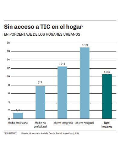 El segundo gráfico muestra que solo el 1,4% de los hogares donde hay un profesional medio, no tiene acceso a las TICS. En contraste, el acceso es limitado en el 12,4% de los hogares de obreros integrados (registrados) y en el 16,9% de los hogares de los obreros marginales.