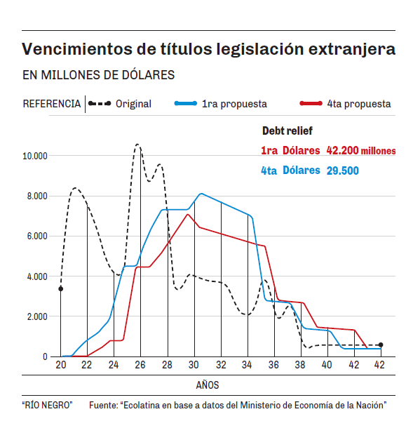 El segundo gráfico que acompaña la nota, muestra el perfil de los vencimientos de la deuda argentina en millones de dólares, hasta el año 2042. Se aprecia con claridad el alivio financiero que se genera mediante la re estructuración en las finanzas públicas hasta 2024. Se observa además la mejora sustancial que ofrece Argentina en la última oferta, en relación a la propuesta original. El “debt relief” o alivio de la deuda generado en la primera oferta era de u$s 42.200 millones. Las pretensiones argentinas se redujeron hasta alcanzar un debt relief de u$s 29.500, un 30% menos.