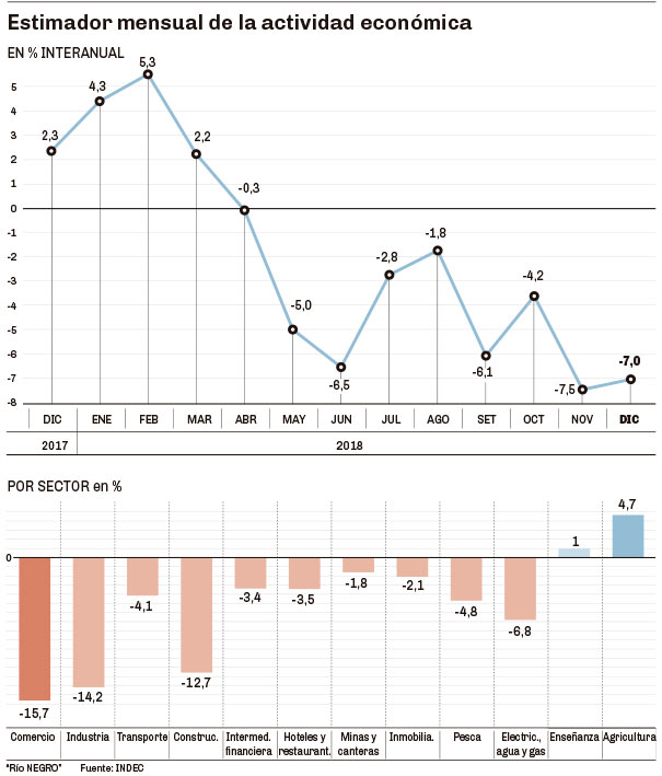 La economía cayó 7% en diciembre y en 2018 cerró con una baja de 2,6%