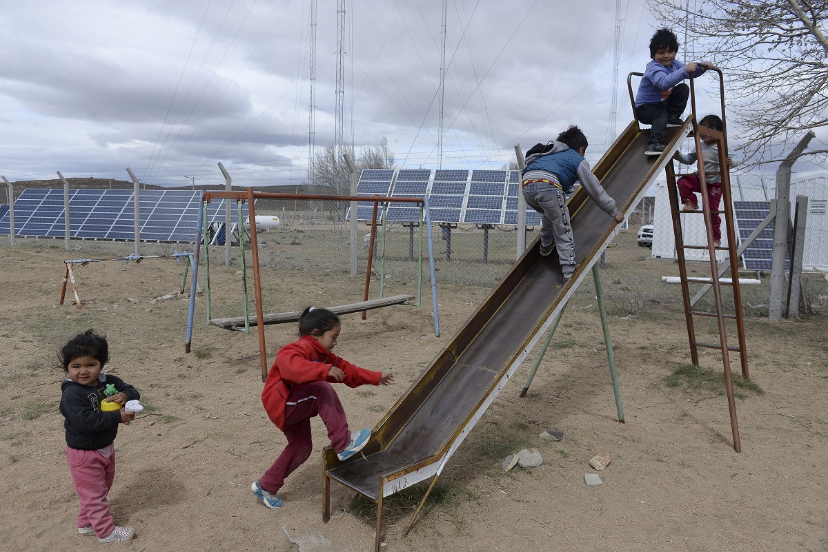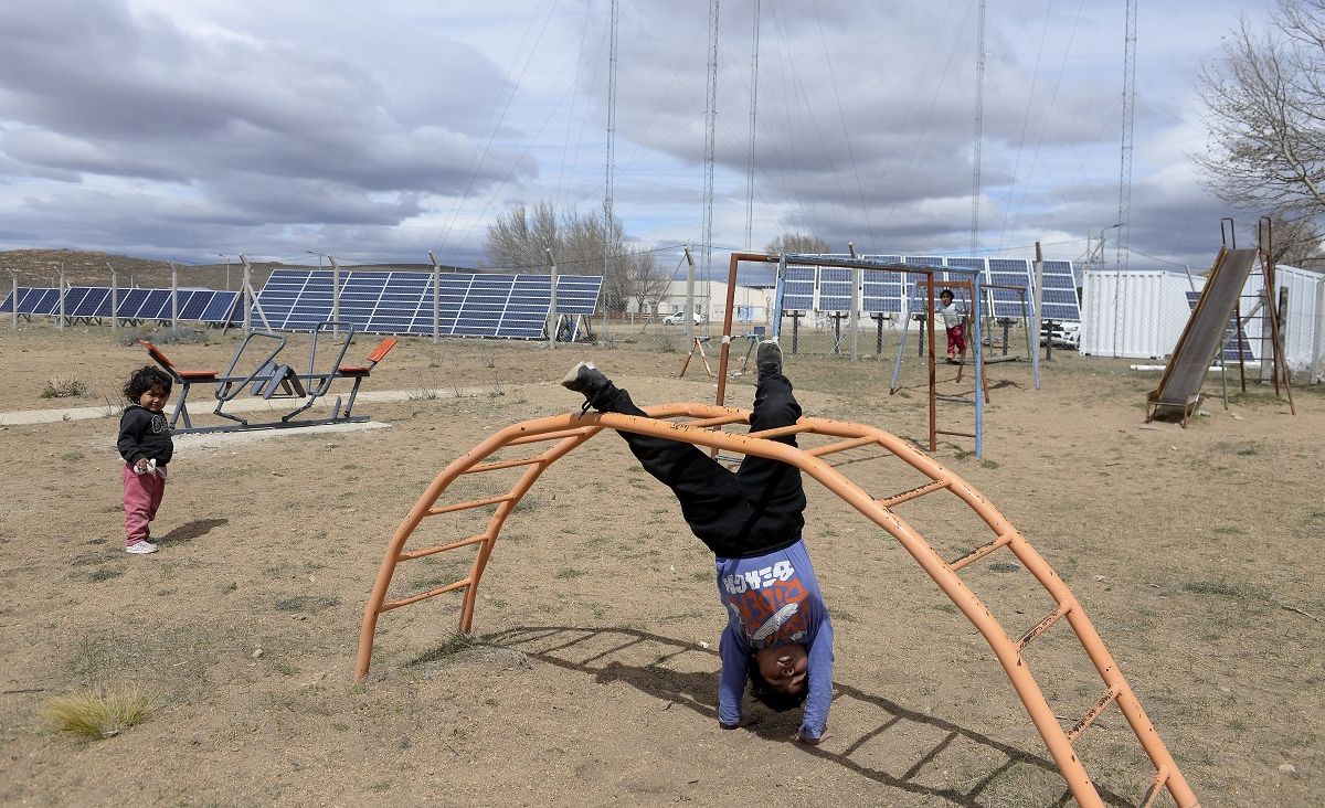 Un grupo de niños de mejillas curtidas por el viento se divierte en los juegos de la plaza, en un mediodía tranquilo en Laguna Blanca, sin saber qué son esos enormes paneles que se levantan detrás, donde desde hace algunas semanas hay movimiento de gente con cascos y mamelucos blancos como si fueran al espacio.