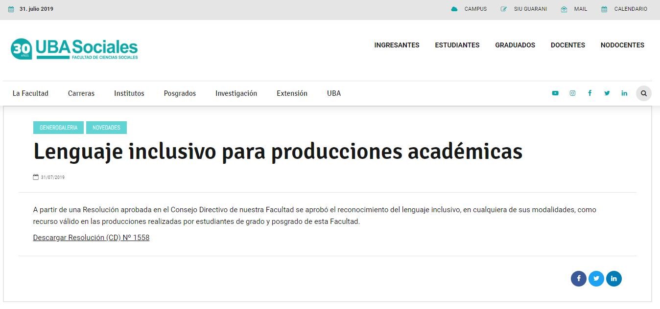 La Facultad de Ciencias Sociales de la Universidad de Buenos Aires (UBA) aprobó el reconocimiento del lenguaje inclusivo «como recurso válido en las producciones realizadas por estudiantes de grado y posgrado».