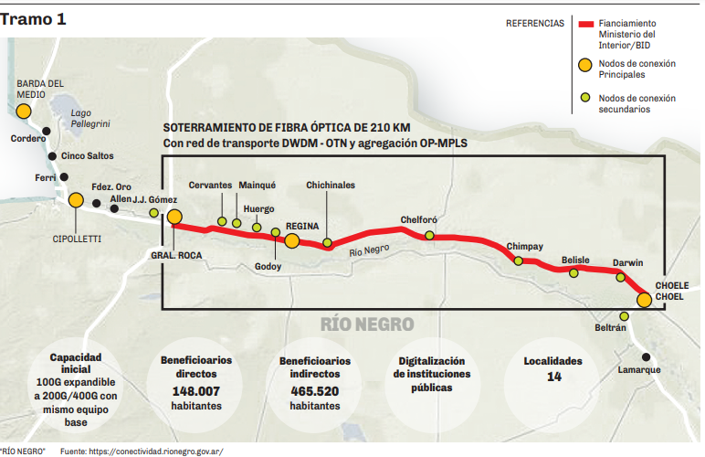 El tramo 1 incluye el recorrido de 210 km de fibra óptica sobre 14 localidades comprendidas entre Choele Choel y Roca, a través de un Aporte No Reembolsable (ANR) $431.985.057,12.