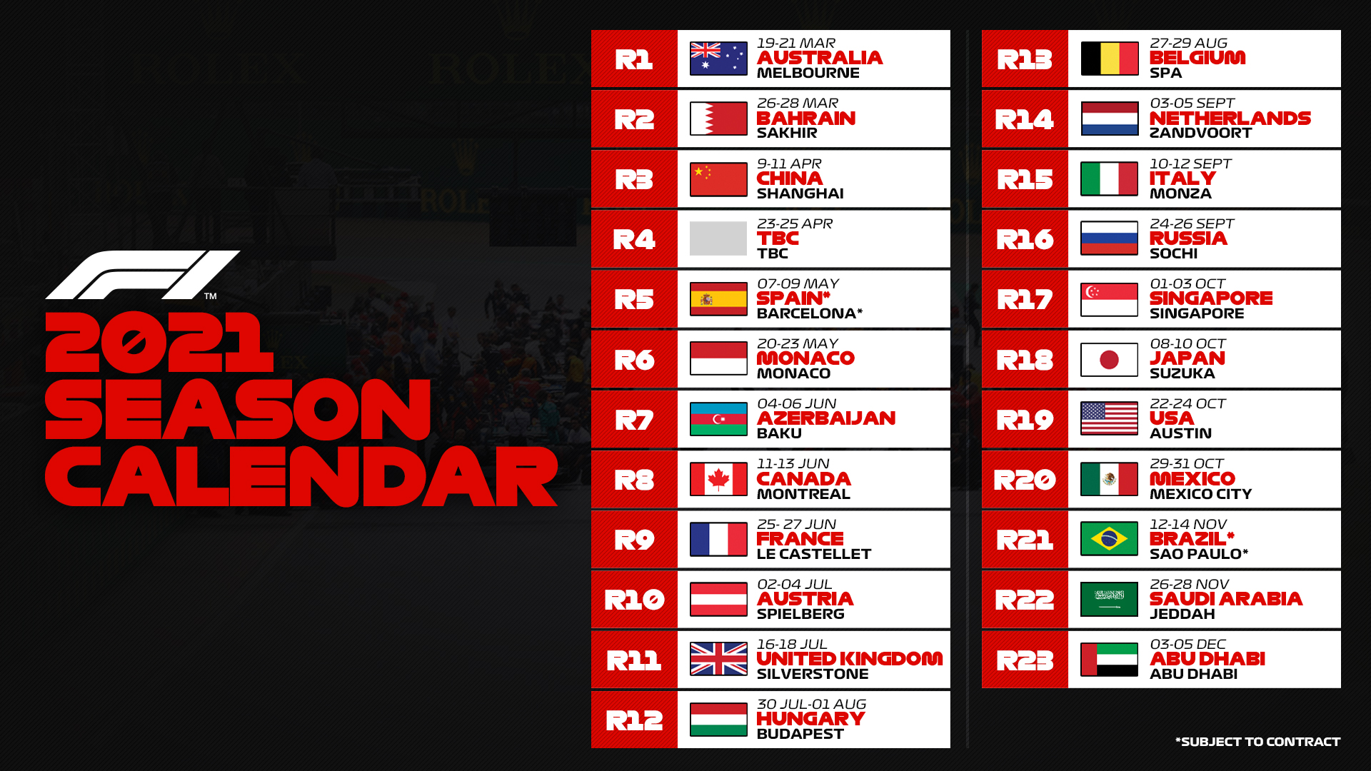 Los organizadores del Mundial de Fórmula 1 anunciaron el programa provisional para el 2021, que consta en principio de 23 pruebas, lo que récord histórico para un certamen, con fecha de inicio el 21 de marzo en Melbourne,