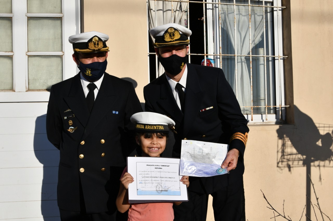 El Capitán de la Fragata A.R.A. “Libertad” y Director de la Escuela de buceo de la Armada Argentina, Pablo Teramo, le entregó un diploma de gaviera honoraria a una pequeña de Carmen de Patagones. Se trata de Angelina Carranza, que además de cumplir 7 años fue quien, ante la imposibilidad de concurrir a ver la Fragata en El Cóndor en junio, había realizado un dibujo expresando el deseo de formar parte de la Fragata Libertad cuando sea grande.