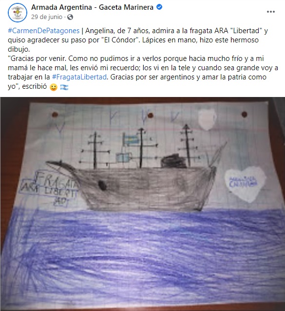 La imagen y la historia cayó en manos de la Armada Argentina que le devolvió ese gesto y hoy el Capitán de la Fragata, Teramo, junto a Gonzalo Canosa, Teniente de navío y Jefe de logística de la Escuela de buceo de la Armada; le entregaron un diploma realizado por el propio comandante de la Fragata, Capitán de Navío, Osvaldo Chiñi, quien también le obsequió a Angelina el tradicional gorro de marinero de la Armada Argentina, en representación del Director General de Educación Naval Contralmirante, Marcelo Tarapow.