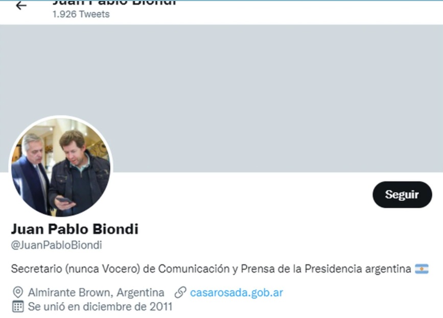 Es que en su descripción de Twitter, Biondi escribió «secretario (nunca vocero) de Comunicación y Prensa de la Presidencia argentina», en respuesta a la descripción que hizo CFK en su carta: «es un raro caso: un vocero presidencial al que nadie le conoce la voz».