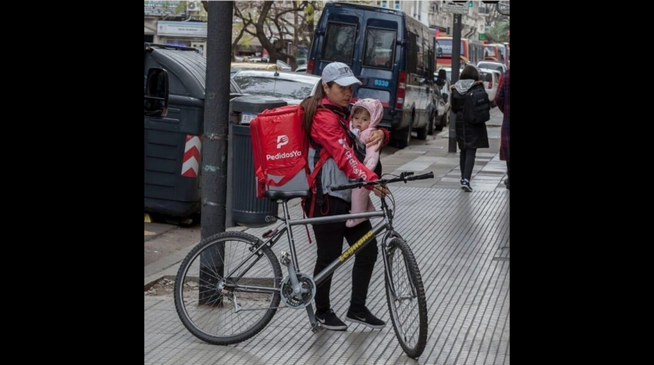 La foto de una mujer con el uniforme de PedidosYa cargando a un bebé se hizo viral en las redes sociales. Muchos de los usuarios y políticos que compartieron la imagen aseguraron que reflejaba la precarización laboral, considerando que tenía que llevar a su hija al trabajo. Sin embargo, eso es falso. Reverso dio con la protagonista, quien explicó que cuando fue fotografiada llevaba a su hija a pie al jardín antes de salir a trabajar. Contó que es venezolana y llegó en 2018. El fotógrafo que capturó el momento aseguró que no la vio andar en bicicleta con la bebé y lo mismo confirmó un colega repartidor.