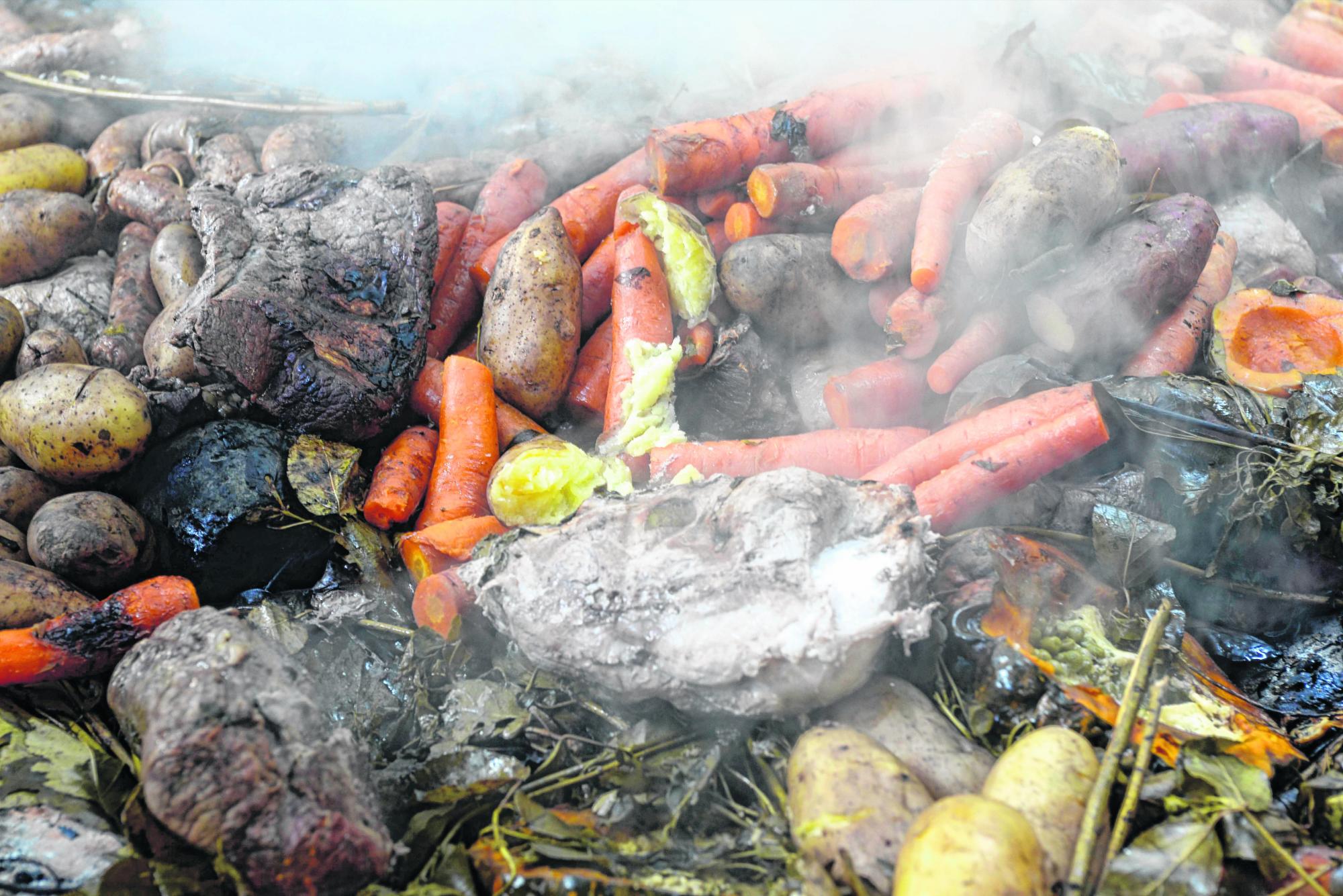 Después de una hora u hora y cuarto, se descubre y se distribuye en bandejas para los cientos de comensales que esperan su porción que contiene carne vacuna, cordero, chorizo y pollo, papas, zanahorias, batatas, zapallo con arvejas y queso, y manzanas. Es el momento cúlmine para los turistas y residentes que se agolpan junto al hoyo para tomar fotografías y filmar con sus celulares.