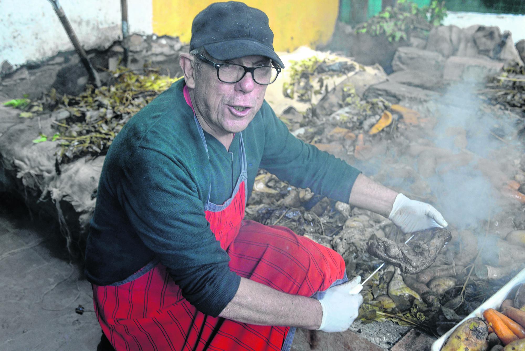 “No es ahumado, tiene un leve gusto a humo pero no es tan fuerte, no tiene ningún aderezo, es totalmente natural y con el producto final la gente se queda maravillada”, dice el popular hombre del curanto de Colonia Suiza, Jorge Rubén Nielsen Goye, más conocido como el “Gringo”, que cada miércoles y domingo cocina esta delicia en la tierra con las enseñanzas que su tío abuelo Neutral Goye le dejó.