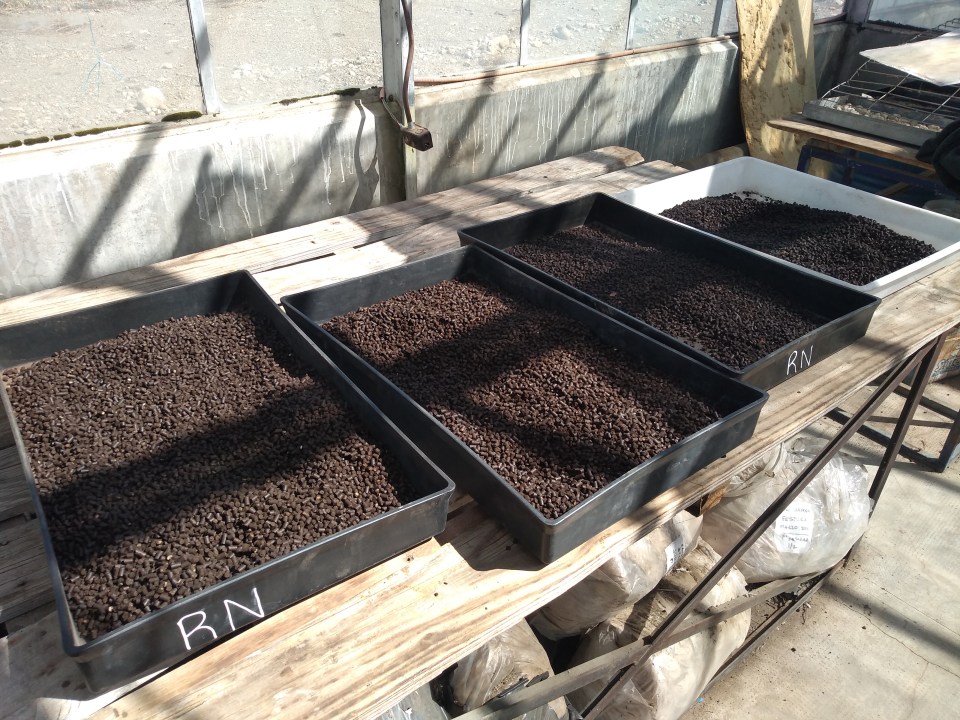 En este caso, los pellets fueron formulados a partir del compostaje de residuos pecuarios provenientes de estiércoles vacunos, y ave de corral, pero también es posible utilizar compost de restos de comida domiciliarios. La materia orgánica fue acondicionada mediante un sistema de compostaje, que se realizó a campo, con remoción mecanizada (en inglés, windrow composting).