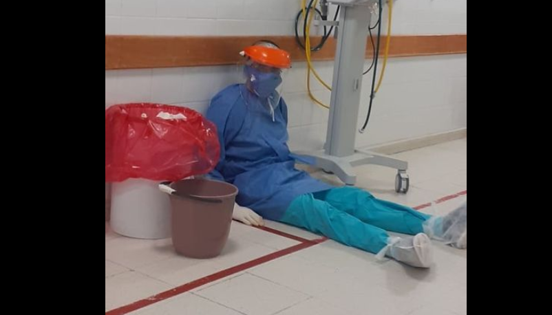 «Es un médico de guardia del hospital Cutral Co en terapia. Son las 3 a.m. del.dia 4/10/2020. Acaba de intubar un paciente», escribió Aldo Beitia en su posteo donde se muestra un trabajador sentado en el suelo.