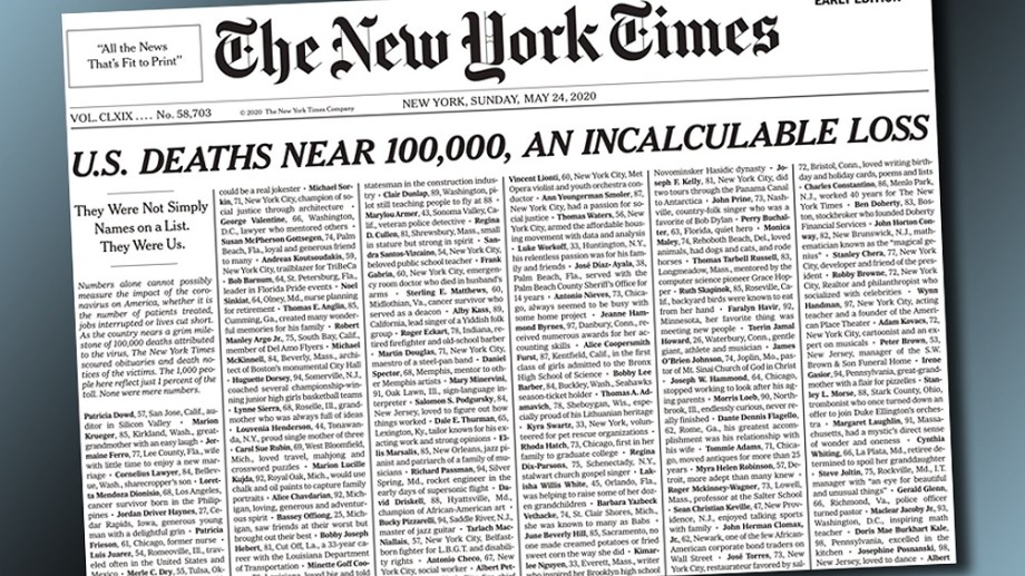 La histórica tapa fue anticipada por el diario, uno de los más prestigiosos del mundo, durante la tarde de este sábado y en la imagen se lee un título que ocupa todas las columnas de la primera página con el enunciado: «Las muertes en EE.UU. se acercan a 100.000, una pérdida incalculable».