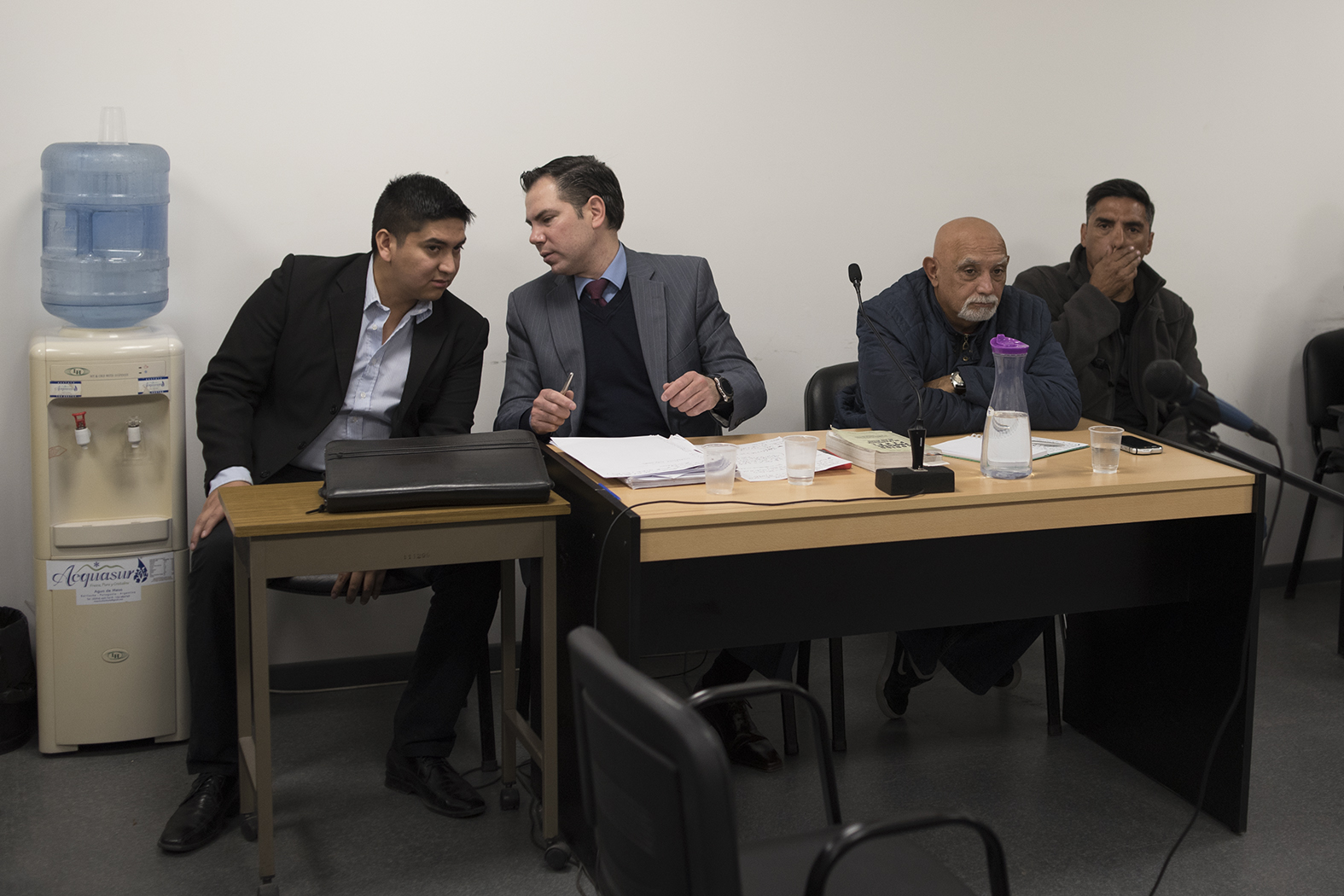 Los imputados Federico Valenzuela Campos (a la izquierda) y Néstor Meyrelles (a la derecha), junto a sus defensores. (Marcelo Martínez)