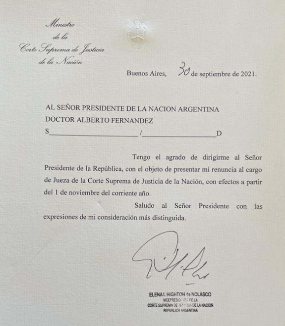 «Tengo el agrado de dirigirme al Señor Presidente de la República, con el objeto de presentar mi renuncia al cargo de Jueza de la Corte Suprema de Justicia de la Nación, con efectos a partir del 1 de noviembre del corriente año”, señala la misiva fechada el 30 de septiembre pero conocida hoy a través del Centro de Información Judicial (CIJ).