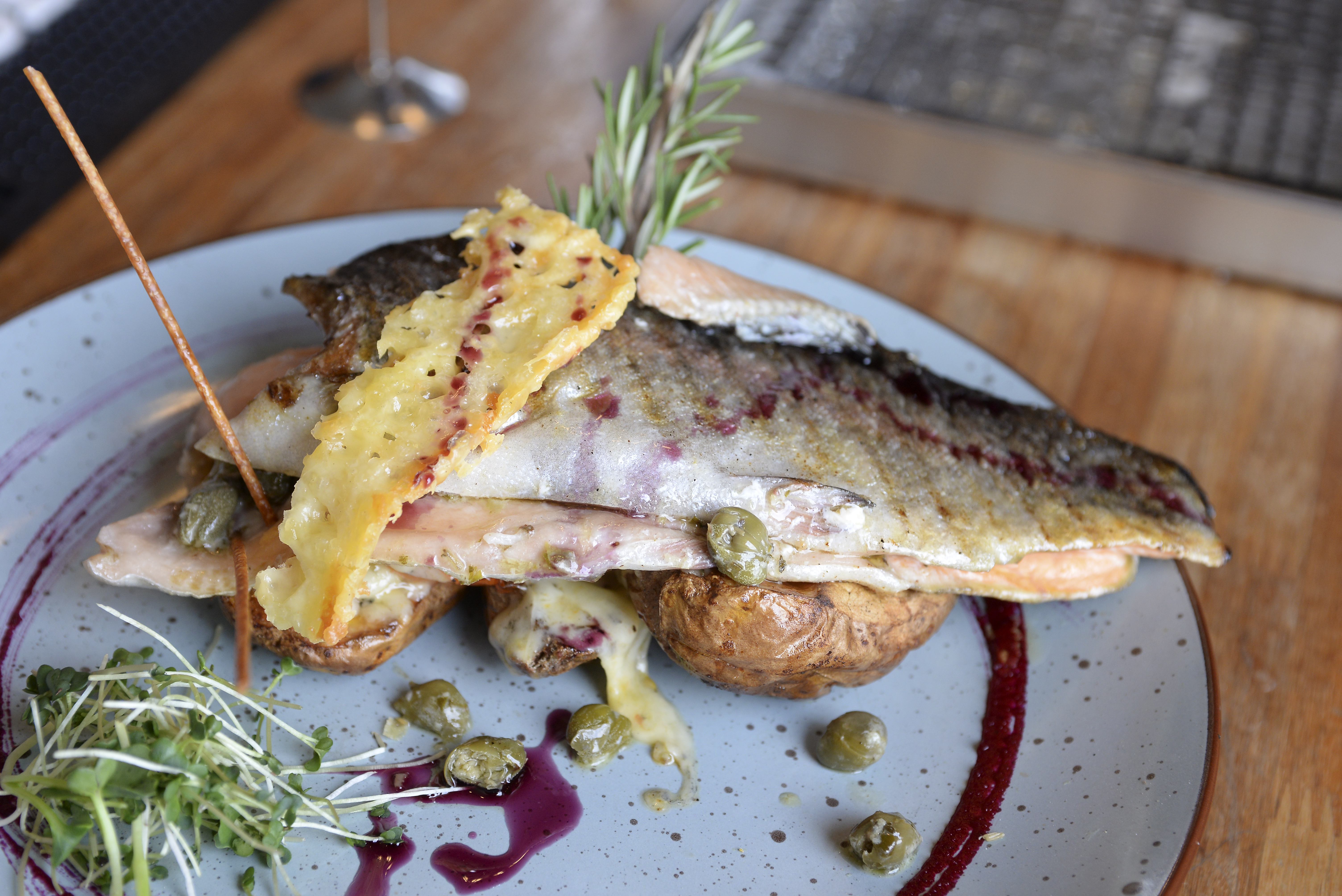 Los destacados de la carta son la trucha con crocante de queso y brotes ($610), ribs de cerdo estilo americano con barbacoa y papa ($580) y entre las pastas la lasagna de cordero con salsa ($580) y raviolones de trucha con masa verde ($580).