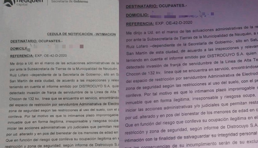 La Municipalidad de Neuquén envió notificaciones de desalojo a vecinos y vecinas que habitan entre los barrios Provincias Unidas y Sapere. Gremios y organizaciones critican que el pedido se hace durante la cuarentena por el coronavirus, algo que no está prohibido por Nación.