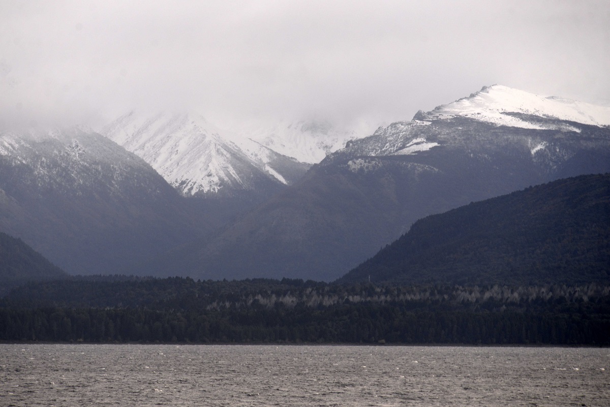 El cordón montañoso frente al lago Nahuel Huapi luce hoy con nieve en las cotas más altas. Lo mismo ocurre en las montañas del sur de Bariloche y del oeste, como el cerro Catedral.