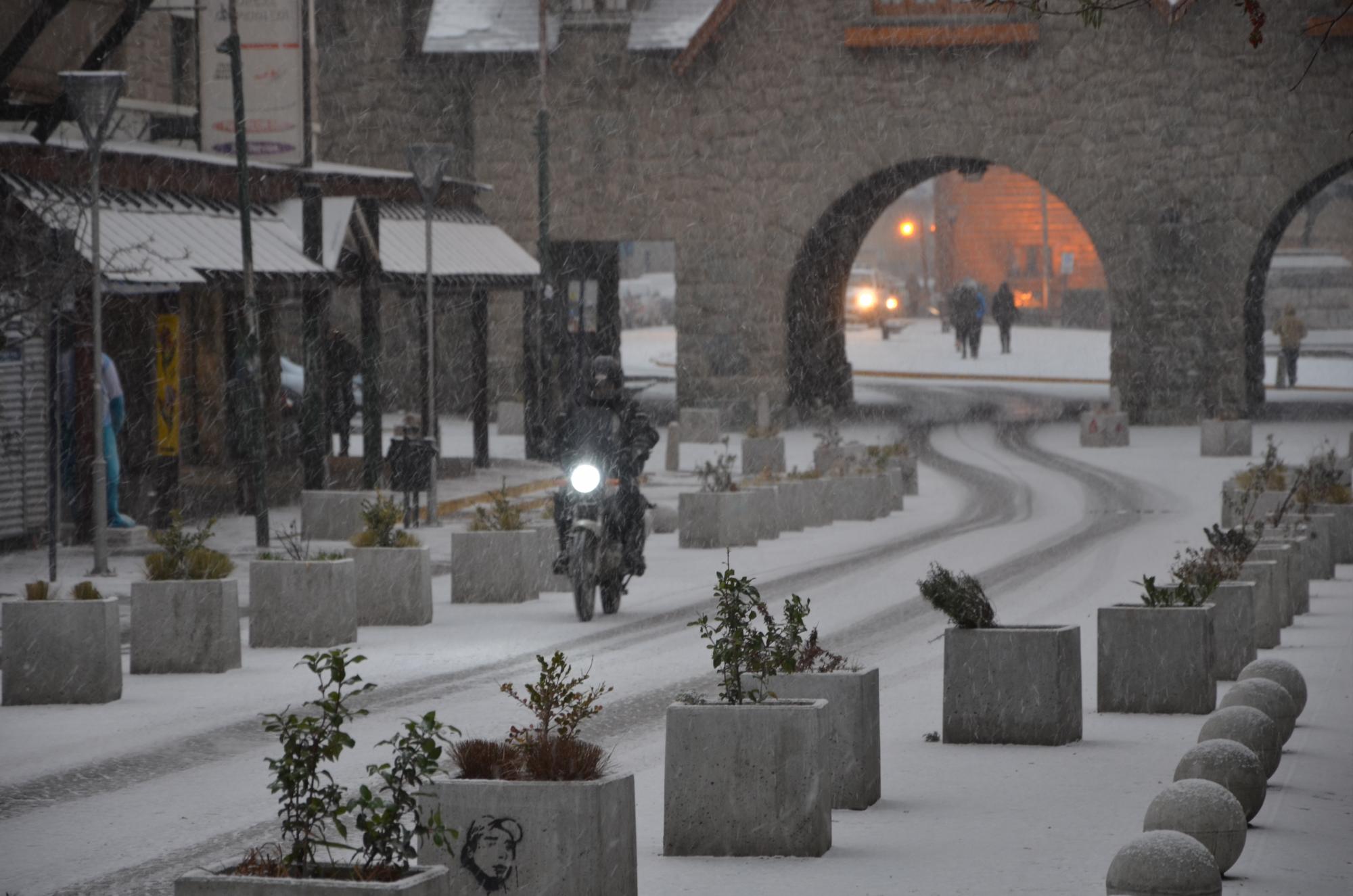 Una fina capa de nieve fue acumulándose desde las 8,40 de este miércoles en las calles del centro de Bariloche, para sorpresa de los que a esa hora se apuraban por ir a trabajar y los pocos turistas que recorrían la calle Mitre.