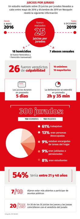 Los juicios por jurado se realizan en Neuquén desde 2014. Están reservados para casos criminales graves, en los que la pretensión de la fiscalía es pedir una pena mayor a 15 años. El Instituto de Estudios Comparados en Ciencias Penales y Sociales (Inecip) analizó 25 juicios en la provincia en el período que va desde el 6 de mayo de 2016 hasta el 31 de diciembre de 2019. Observó audiencias, charló con jueces, juezas, fiscales, equipos de defensa, y lo más importante: encuestó a quienes tomaron esas decisiones, y en algunos casos, logró que participaran de entrevistas grupales.