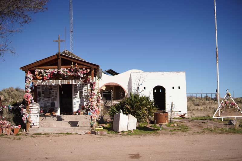 Una tumba y la punta del cajón que sobresale al pie de un alpataco a 10 km de Aguada Guzmán, a la vera de ese camino de tierra en la estepa. Una sepultura precaria librada a su suerte en un perdido punto de la Patagonia, que después se hace capilla de adobe y más tarde santuario, con flores dejadas por los fieles, velas encendidas, el viento que lleva el sonido de la campana al campo despoblado, sus restos ya en el interior de la ermita y ofrendas, billetes, monedas, cigarrillos, botellas.