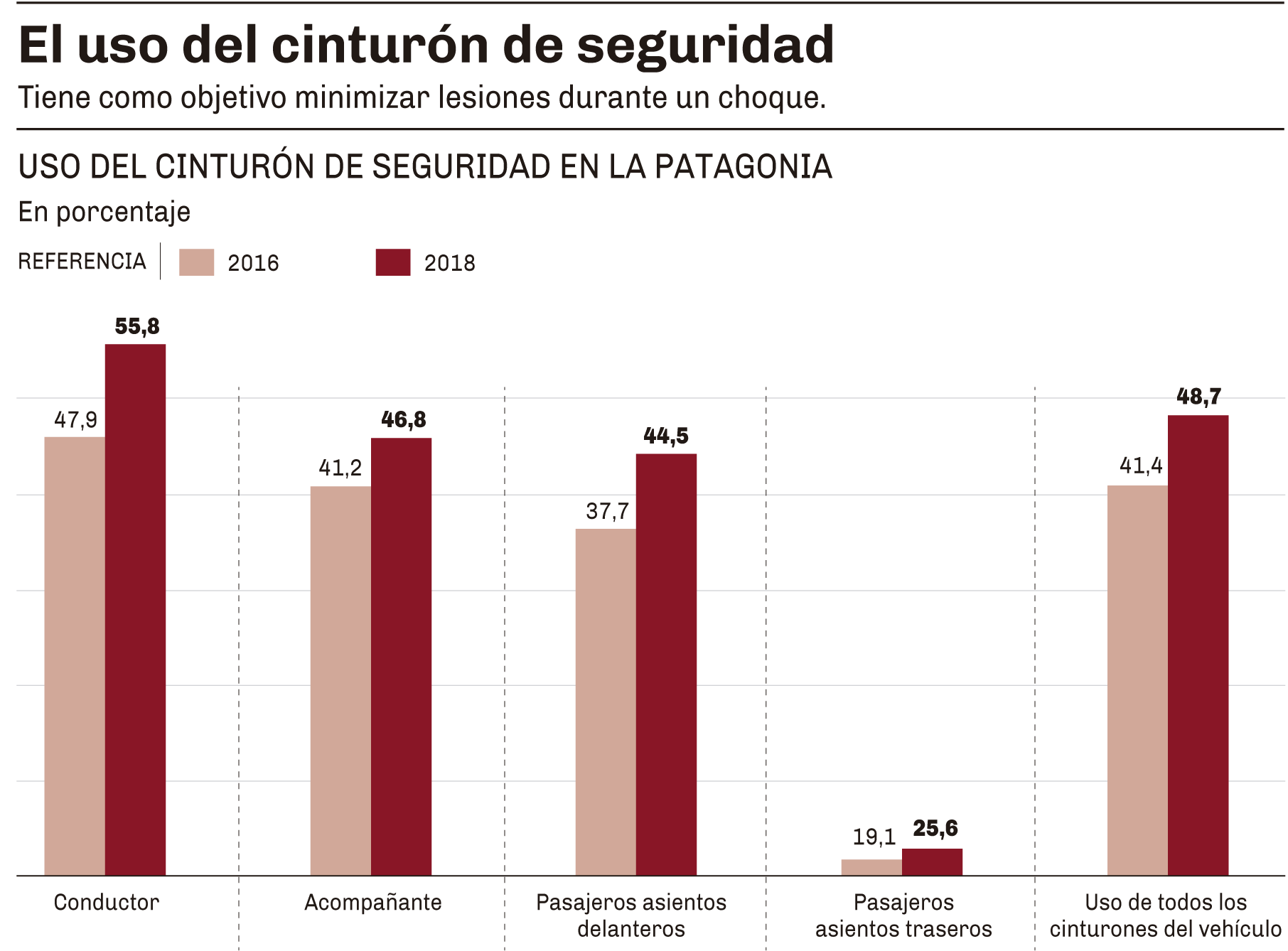 A nivel general, y respecto de la última medición (que fue hecha en 2016), se observa un crecimiento del uso del cinturón únicamente entre conductores (del 50,2% en 2016 al 55% en 2018). El uso de cinturón entre copilotos se mantiene estable, mientras que entre ocupantes traseros tiende a la baja (del 23,1% en 2016 al 19,9% en 2018). Por eso, el hecho de que la Patagonia tenga un crecimiento en ese aspecto, mejora su nota.