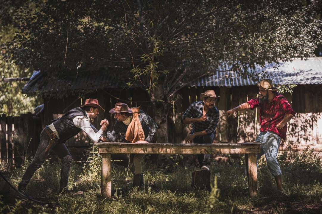 La idea de llevar la estética musical de lo western al universo audiovisual siempre estuvo, solo que era una cuestión de recursos. “Al principio no teníamos ni para los sombreros”, bromea Caramellino. Los sombreros finalmente aparecieron, pero siempre hay cosas a las que adaptarse. “Cuando fuimos a filmar al norte neuquino” cuenta Ezequiel, “teníamos pensado grabar una escena en una capilla, pero al no conseguirla, cambiemos la historia, cambiemos esa escena. Como estábamos en Andacollo, que es una zona pirquineros buscadores de oro en los ríos y las montañas, decidimos incorporar ese personaje, así el forajido le robaba el oro a un pirquinero.
