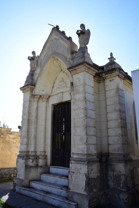 De tan antiguas, las paredes del panteón que honró la memoria de Manuela adoptaron el color de las fotos de otro tiempo. Y las grietas que lo recorren agravaron su fragilidad, pero no le restan valor a la estructura como reliquia, que todavía sigue en pie 104 años después, en el sector más histórico del cementerio municipal. Cuatro columnas de estilo romano, estriado y compuesto, combinan el espiral de las volutas con las hojas típicas del orden corintio, escoltando una puerta de hierro, doble hoja, que deja entrever un colorido vitral iluminando el interior, íntimo, privado, que sólo entre parientes conocen.