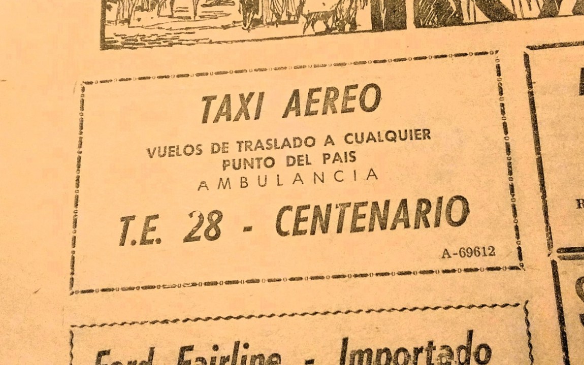 Esa era la base donde se podía coordinar un viaje en “taxi aéreo” con José al mando, una especie de vuelo privado de costo más accesible y menor alcance, aunque sin escalas ni esperas innecesarias. Los traslados sanitarios, de hecho, eran una de las alternativas que se ofrecían, sumados a los viajes express de artistas y hasta grandes chacareros. “La localidad de Centenario, como fidedigna expresión del progreso alcanzado a través de sus 45 años de vida, cuenta con un servicio que puede calificarse como excepcional. Es la única de nuestra zona que posee un servicio así”, destacaba RÍO NEGRO en su versión impresa. Según el aviso publicitario, cualquier consulta podía realizarse por teléfono llamando al N° 28, dato que da cuenta de la baja densidad poblacional que allí habitaba, al menos con acceso a la comunicación.