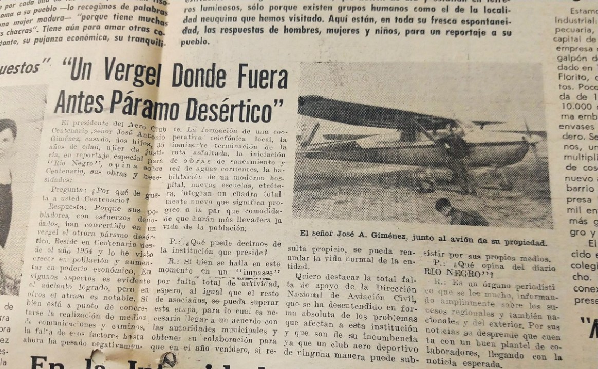 Vicente Stagnaro es quizás quien más archivo guarda al respecto. El entrenador y aficionado por la historia local dialogó con este medio para compartir lo que atesoraba sobre la actividad aeronáutica y sus referentes en esa ciudad neuquina. En la época de Giménez, contó, se incorporaron dos avionetas al primer avión triplaza que poseía la entidad, gracias a la ayuda de los productores, ya que era la fruticultura el principal motor económico del lugar. “Mucha gente recuerda que en las Fiestas Patrias o Aniversarios, les daban a los vecinos la posibilidad de volar un ratito en forma gratuita o con una colaboración desinteresada”, relató.