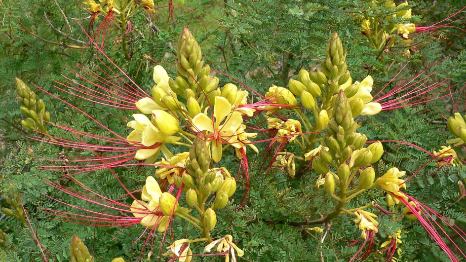La naturaleza nos brinda una especie silvestre de cualidades ornamentales con una floración muy llamativa de color amarillo, en forma de espiga desprendiendo un destacado manojo de estambres rojos. Se trata de la especie comúnmente conocida como “lagaña de perro “, “azote o disciplina de Monja”, “mal de ojos”, “Cesalpinia” o el nombre más popular “barba de chivo”, dependiendo la región en donde habita.