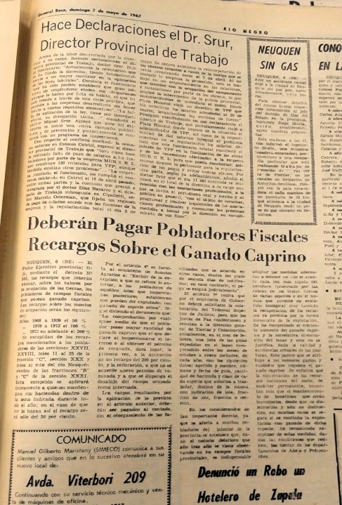 El reconocido investigador radicado en Huinganco, Isidro Belver, recordó que se lo vinculaba a la familia del ingeniero Rodolfo Rosauer, interventor de la gobernación neuquina durante el golpe de estado de Onganía, entre 1966 y 1970. El dato coincide con el decreto que aplicó ese funcionario en 1967, para desalentar la cría de chivos, argumentando el daño que generaba el pastoreo en la región. Sin embargo, el rumor por aquellos años, evocó Belver, era que en realidad se pretendía habilitar en esas tierras un espacio privado donde promover la caza de especies importadas. Formalizada la versión o no, lo cierto es que el impacto en los crianceros fue grave, porque el decreto 505 consistía en el cobro de un costoso arancel por el uso de la tierra fiscal para ganado caprino. ¿Cómo tener título de las parcelas para una actividad que vive en movimiento? ¿Cómo pagar por el piño que ya tenían si apenas subsistían?