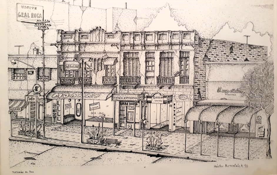 Definidos por él mismo como “dibujos documentales”, los trabajos de este nacido en 9 de Julio, provincia de Buenos Aires, comenzaron a crecer en volumen y en reconocimiento cuando comenzó a regalarlos a los referentes de las tiendas e instituciones que elegía para ilustrar: la Estación de tren, el Colegio Nacional, la Intendencia de Riego, la librería “Delgado” (Tucumán y Sarmiento), el Café 43, El Viejo Molino y muchas más. Así, sin ambición, dijo su hija Juliana, en diálogo con RÍO NEGRO.