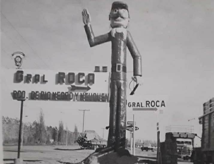 La foto aparece cada tanto, en algunos sitios de Facebook, en Instagram. Son fotos rescatadas del recuerdo, de alguna caja perdida. Y allí se lo ve, erguido, con gesto más simpático que solemne, los ojos abiertos como dos botones, una mano en posición de saludo. Es, era más bien, El soldado del desierto, una escultura en madera, de unos tres metros y medio, que en 1968 abría el ingreso a Roca y junto a la que muchos turistas y locales se fotografiaban.