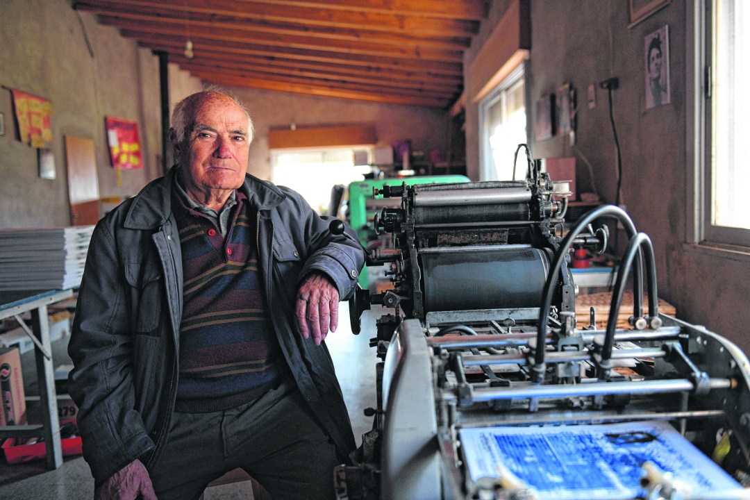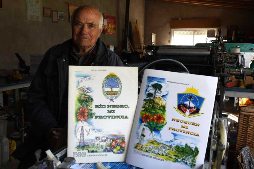 Marcelino cuenta su infancia con la distancia que dan los años, como si le hubiera ocurrido a otro. Lo cuenta, memorioso y calmo, mientras recorre el galpón que él mismo levantó a un costado de su vivienda, en Stefenelli, una estructura alargada y luminosa que bien podría ser un museo: hay una vieja impresora offset, otra apenas más nueva pero ya en desuso, una mesa de tablones de más de tres metros repleta de papeles, un exhibidor en el que muestra orgulloso el primer ejemplar del libro de “Río Negro, mi provincia”, de 1976, el segundo, el tercero, el cuarto y los que vinieron después: el libro de lectura “Amancay”, “General Roca, mi ciudad”, “Neuquén, mi provincia”, “Historias y leyendas patagónicas”. Salvo las más nuevas, que tienen papel brillante y son a color, las otras tienen el formato de papel oficio, en un blanco y negro que muestra el desgaste y el color sepia del tiempo.