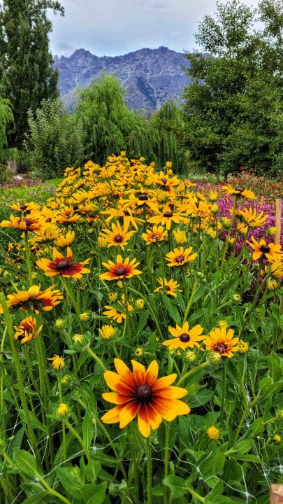 El cerro Piltriquitrón, entre las flores de «Jardín de campo»