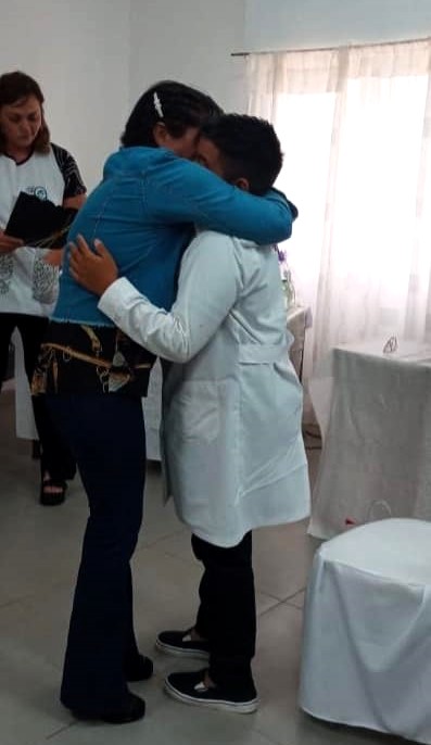 Volviendo a la celebración, terminada la perseverante labor de los asadores, se apilaron todas las sillas del salón de actos y allí mismo se ubicaron los tablones, gaseosas y vasos de colores, para recibir ese manjar tan sencillo y emblemático a la vez. “Es muy emotivo e inspirador, ya que somos pocos y los lazos son más fuertes, como una familia”, dijo la docente Valeria Herrera, a cargo de dictar Matemática, Lengua, Ciencias Sociales y Ciencias Naturales de 2° Plurigrado, o sea, “la seño de Agustín”. Según explicó en diálogo con RÍO NEGRO, si bien la casa de este preadolescente queda en Plaza Huincul, él “transitó toda su escuela primaria en Challacó, entonces fue un acto emotivo, porque dejó su huella en la institución. A su vez, la mamá, Javiela Molina, es una de nuestras auxiliares de servicio hace 18 años. Ese día lo acompañaron con su papá Juan Leiva y el resto de sus seres queridos”, valoró la maestra.