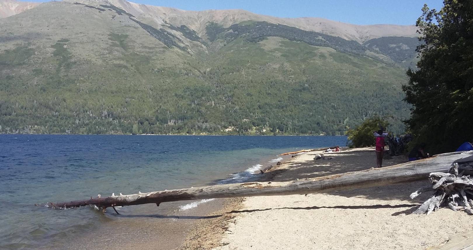 Las ramas de árboles en tonos grises, por el paso del tiempo desde su caída, ingresan de manera horizontal al agua cristalina en una playa de piedras pequeñas y arena en algunos recovecos. Son 200 metros que forman un codo donde se implanta la Playa Muñoz, en un sector solitario del lago Gutiérrez.