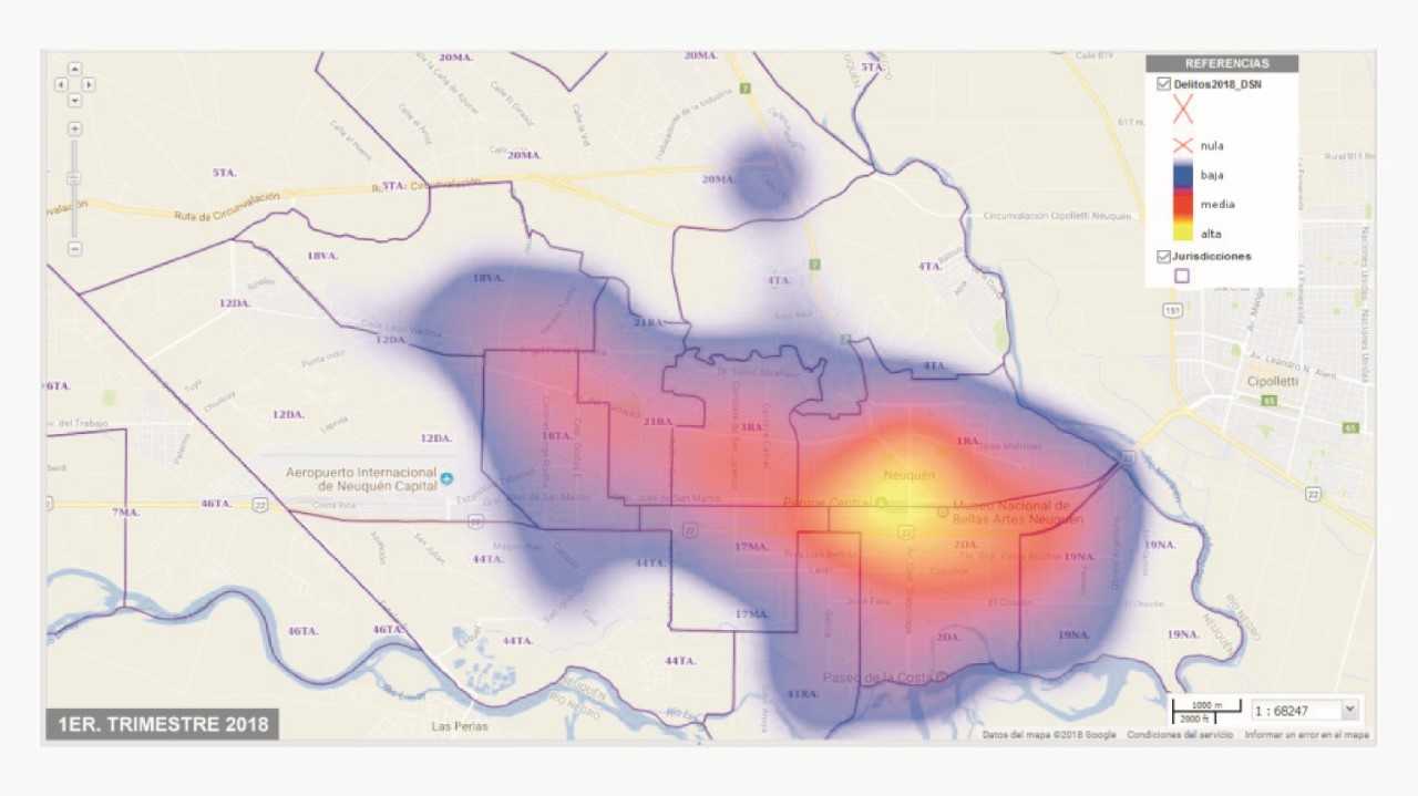 Con un mapa de las zonas calientes de la ciudad, esta mañana la policía mostró las estadísticas que se refieren a los indices delictivos de Neuquén, donde se detallaron las zonas más conflictivas de la ciudad y se pudo observar que el área de mayor cantidad de delitos se circunscribe a un radio de 15 cuadras a las redonda del cruce de la Avenida Olascoaga y la Ruta 22. Dede allí, la franja delictiva se moviliza con mayor fuerza al oeste de la ciudad.