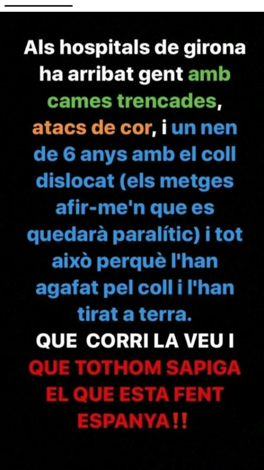 “A los hospitales de Girona, ha llegado gente con piernas rotas, ataques de corazón y un niño de 6 años con el cuello dislocado (los médicos afirman que se quedará paralítico) y todo esto porqué lo han cogido por el cuello y lo han tirado al suelo. Que corra la voz y que todo el mundo sepa lo que está haciendo España…”