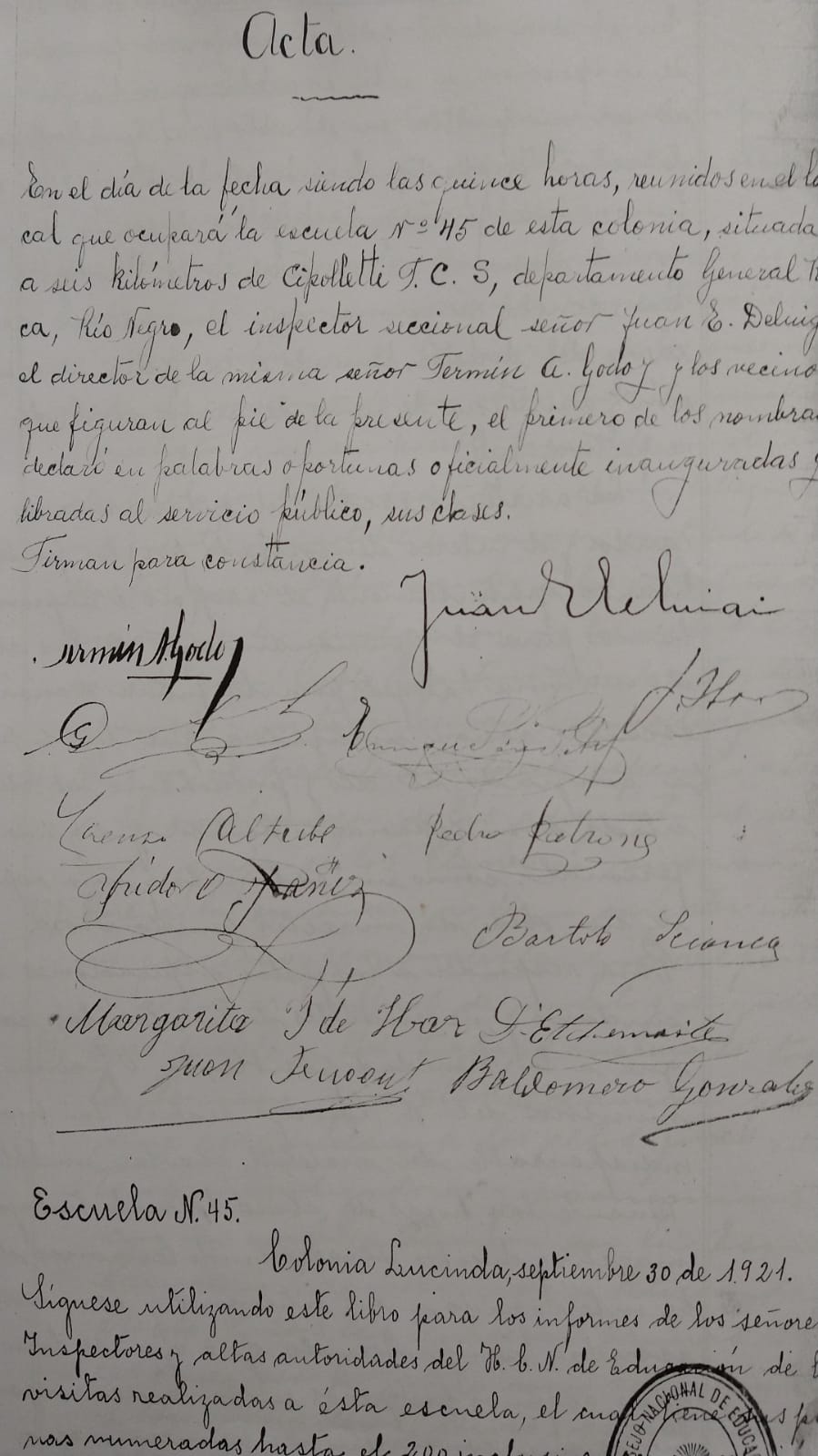 Su abuela Margarita y su abuelo Juan Íbar cedieron en 1921 el primero de los terrenos para que allí funcionara. Otra exalumna, María Teresa Viñuela, hoy docente jubilada del Nivel Inicial, apunta que hacia 1920 “sólo existía la escuela 33 en el centro de Cipolletti, y se impartía enseñanza asistemática en la chacra “La Pochola”. La 45 “se crea por necesidad, esfuerzo y petición de la comunidad de Cuatro Esquinas”. Exploró actas y testimonios y detalla que el Inspector Seccional Juan Deluigi nombró maestro y Director a Fermín Godoy. A cargo del mismo director comenzaron primer grado 43 niños y 33 niñas. “Son los padres quienes facilitan edificio y bancos”, aclara María Teresa. Cuando la matrícula siempre presente fue creciendo, se dividieron sucesivas secciones que por décadas utilizaron sólo tres aulas, que se empleaban en dos turnos.