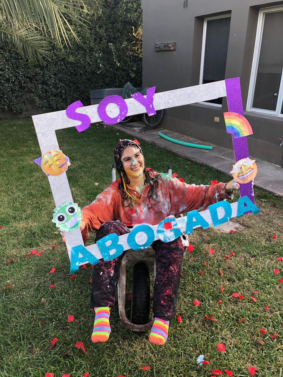 El clima emotivo se rompió para empezar con el clásico festejo de los egresados, esta vez sin compañeros de cursada y sin caravana, pero con los más cercanos a su lado. «Mi papá me subió a la carretilla y empezaron a tirarme espuma y témpera», relató. Después llegó la lluvia de harina y pétalos de rosa, y contó aliviada: «zafé de los huevos».