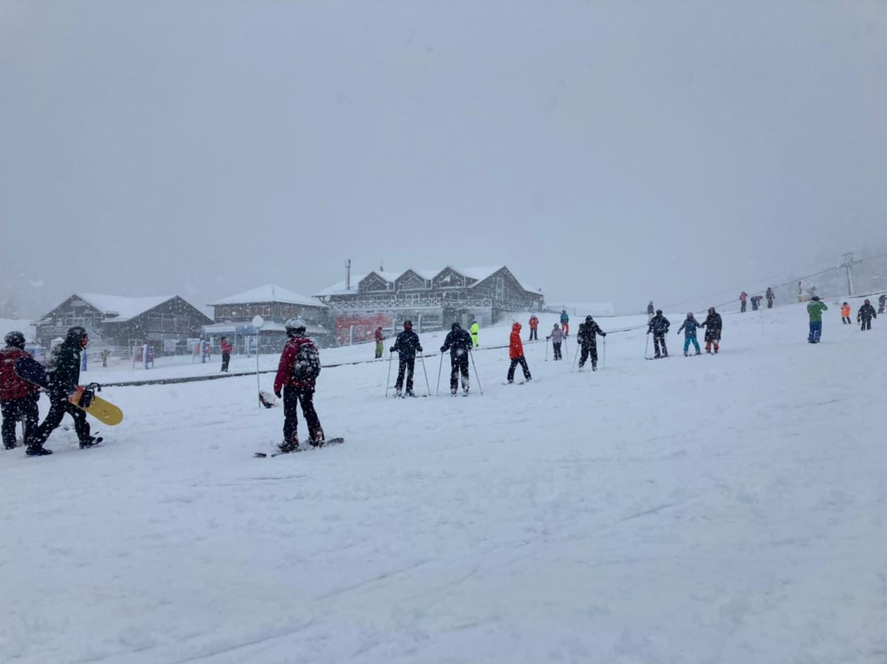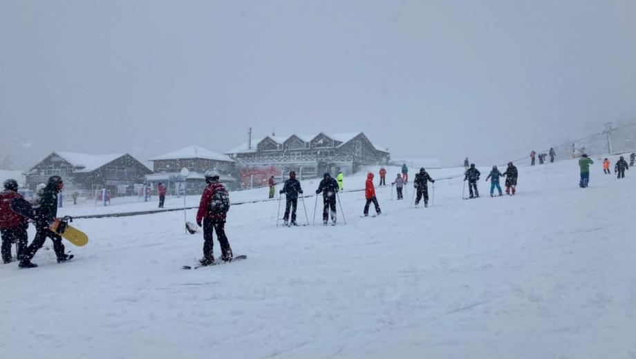 En el cerro Catedral, en este momento, nieva con intensidad. En las últimas 24 horas, se acumularon 15 centímetros en la cumbre y hay 25 centímetros de nieve acumulados en la base que corresponden a la fabricación de los cañones.