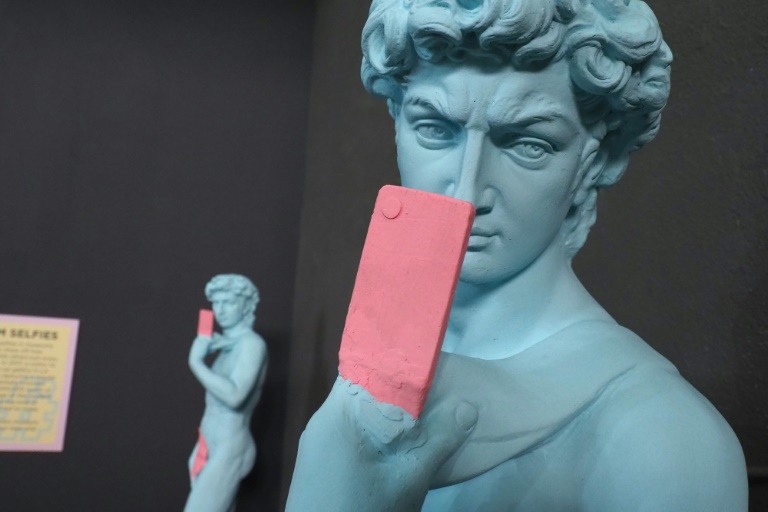 Más adelante, en una esquina, se pueden ver tres estatuas que emulan al David de Miguel Ángel, azules con un celular rosa, y en otra el “Trono del Palo de Selfie”, el mismo concepto del “Trono de hierro” de “Juego de Tronos”.