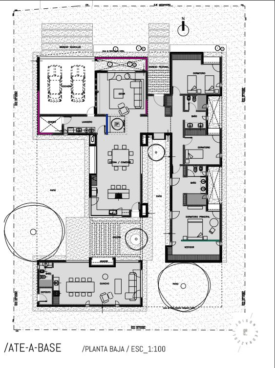 Así es que desde el estudio se propusieron básicamente 2 alas; una conteniendo las habitaciones y baños y la otra correspondiente a la cocina, comedor y estar que están virtualmente unificados.